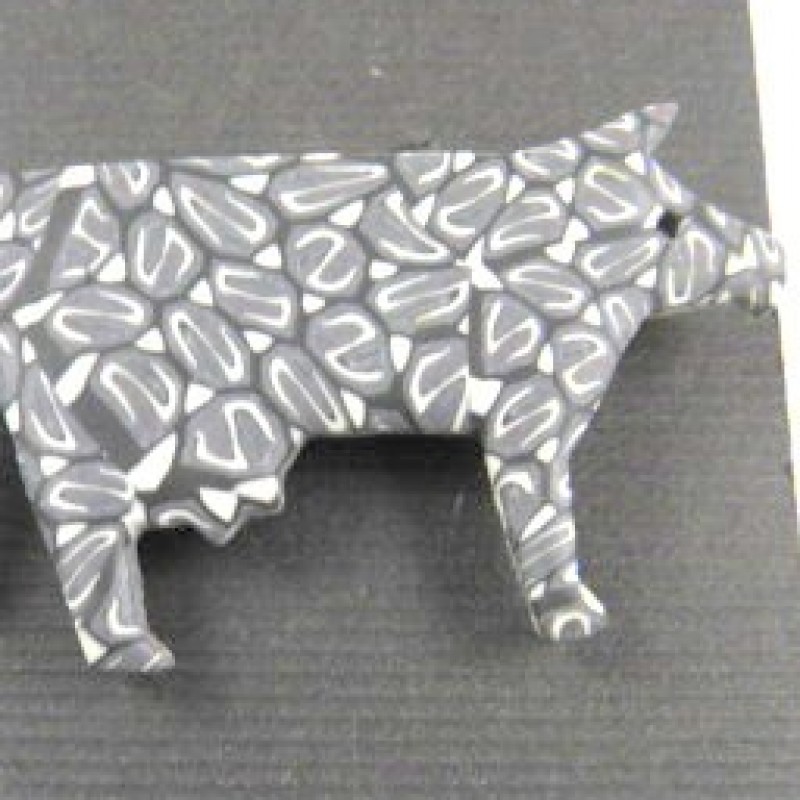 Description: Cute gray/black colored resin cow pin in the style of Lea Stein. This cute piece was hand made by Petronella Daubin in the 90's and is on its original card. It is 2" x 1-1/8" and in very good condition.