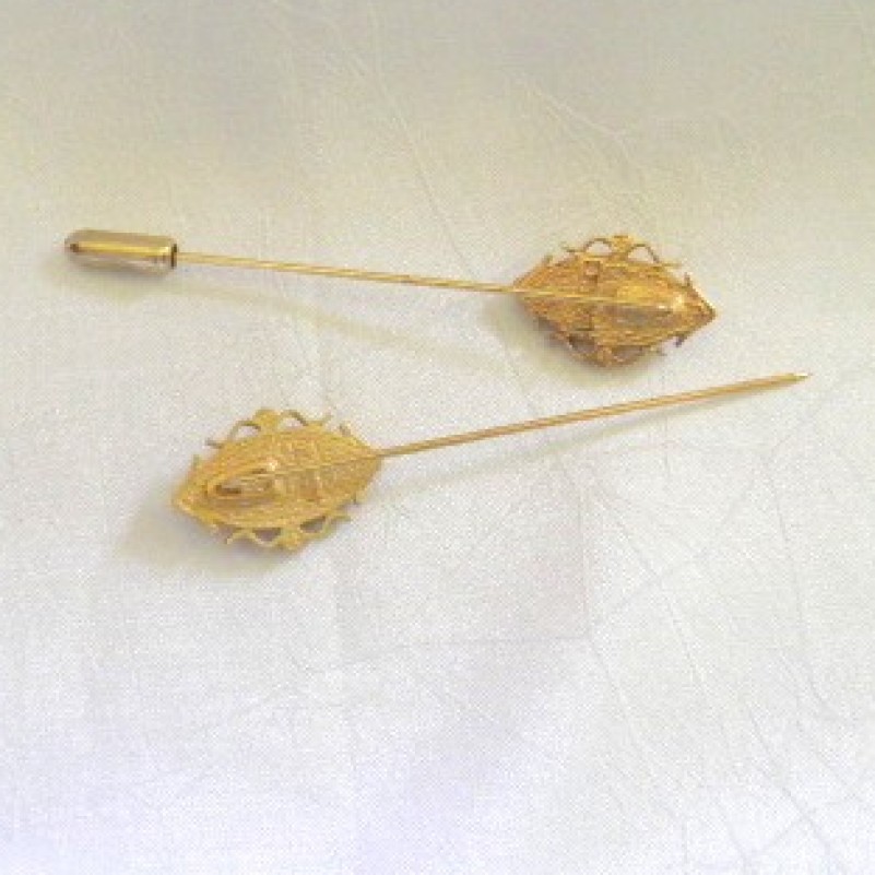 Description: Pair of identical cameo stick pins made and signed by Avon. Gold tone material. One is missing the pin end. Each is 2-5/8" long and in good condition.