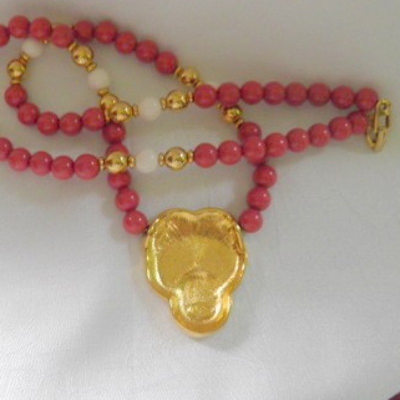 Description: Great beaded necklace signed Napier. This 23" long necklace is comprised of pink, mauve, gold and white beads. the centerpiece is an enameled pink, mauve and off white floral designed piece over a gold tone backing. The clasp is the fold over type. It is in very good condition.