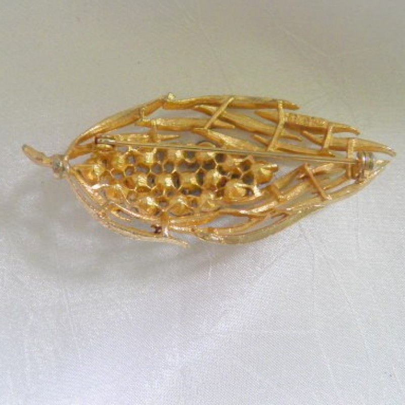 Description: Striking pin signed Lisner. This beautiful pin has three rows of bright blue rhinestones surrounded by burnished gold tone textured leaves. It is 2-7/8 long x 1-1/8" at widest. It is in very good condition.