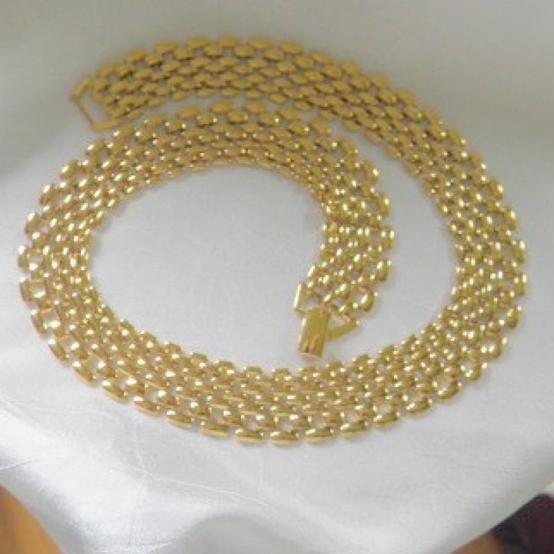 Description: Fantastic gold tone mesh necklace designed by Napier. It is 16" long and almost 3/4" wide with a fold over clasp. It has a patent # marked: Pat. 4,774743 which makes it as being manufactured in 1987 or 1988. It is in very good condition.