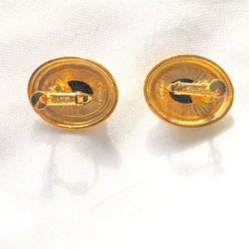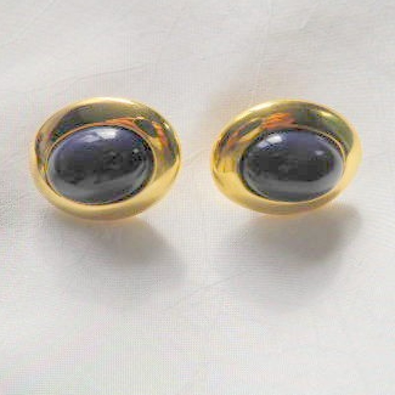 Description: Classic blue and gold earrings made and signed Napier. Oval gold base holds a deep blue/navy glass cab. They are liftable clip screw back style. Size is 1" x 7/8" and condition is good.
