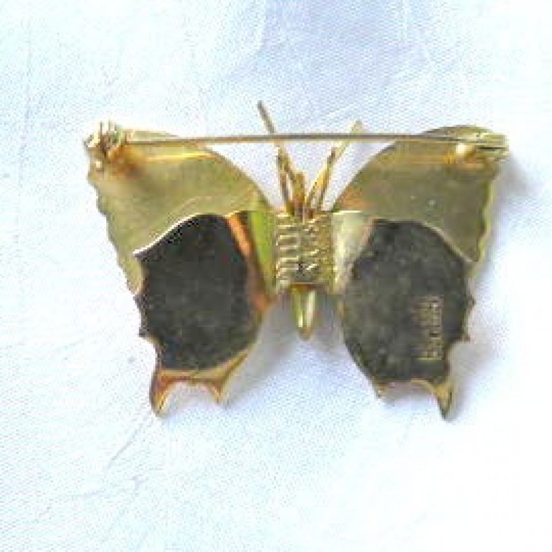 Description: Nice enameled butterfly pin over a gold tone base. Colors are orange, white and black; body and antenna are gold. It is marked Spain and in good condition. The size is 1-5/8" x 1-1/8".