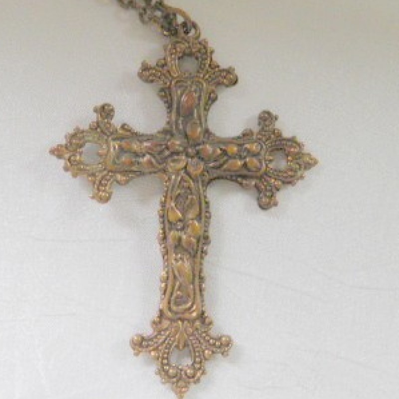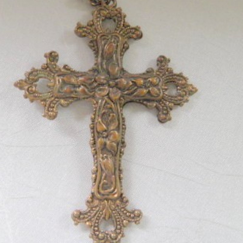 Description: Ornate cross made in brass/bronze metal with intricate embossed floral designs on both sides. It is 3" x 2-1/8"; chain is 24" long. It is unsigned and in good condition.