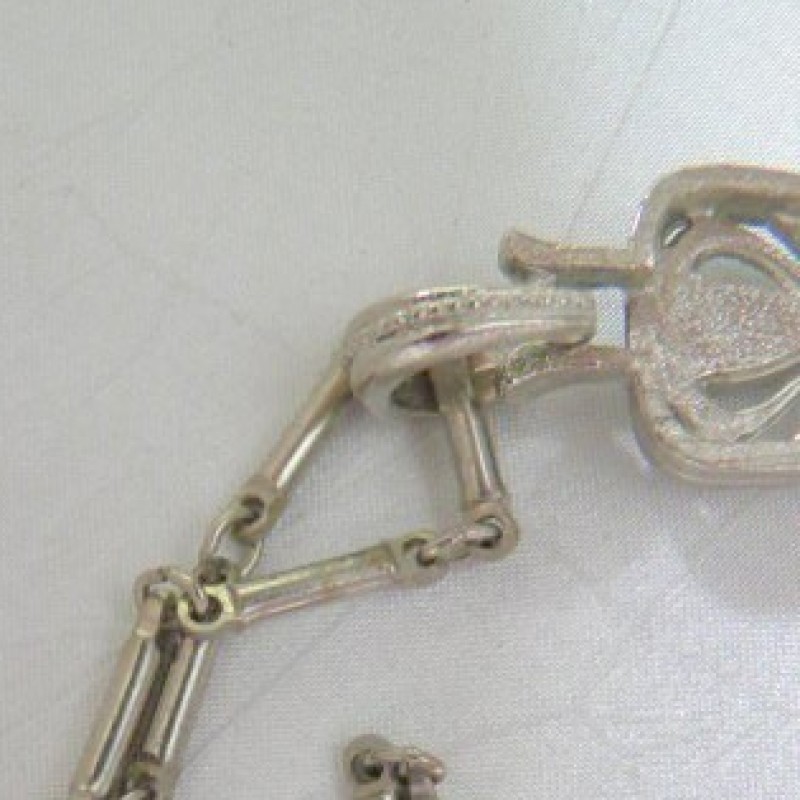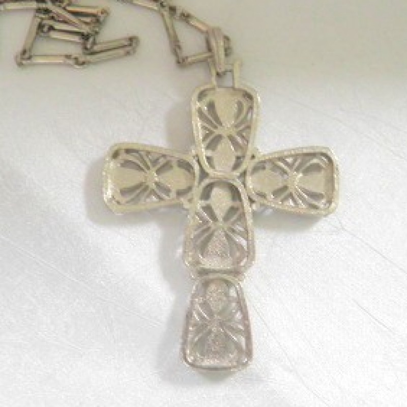 Description: Large cross pendant with teardrop shaped tourquois colored stones. Cross is 2-1/4" x 2-5/8". Chain is 18" long. It is not signed and in good condition.