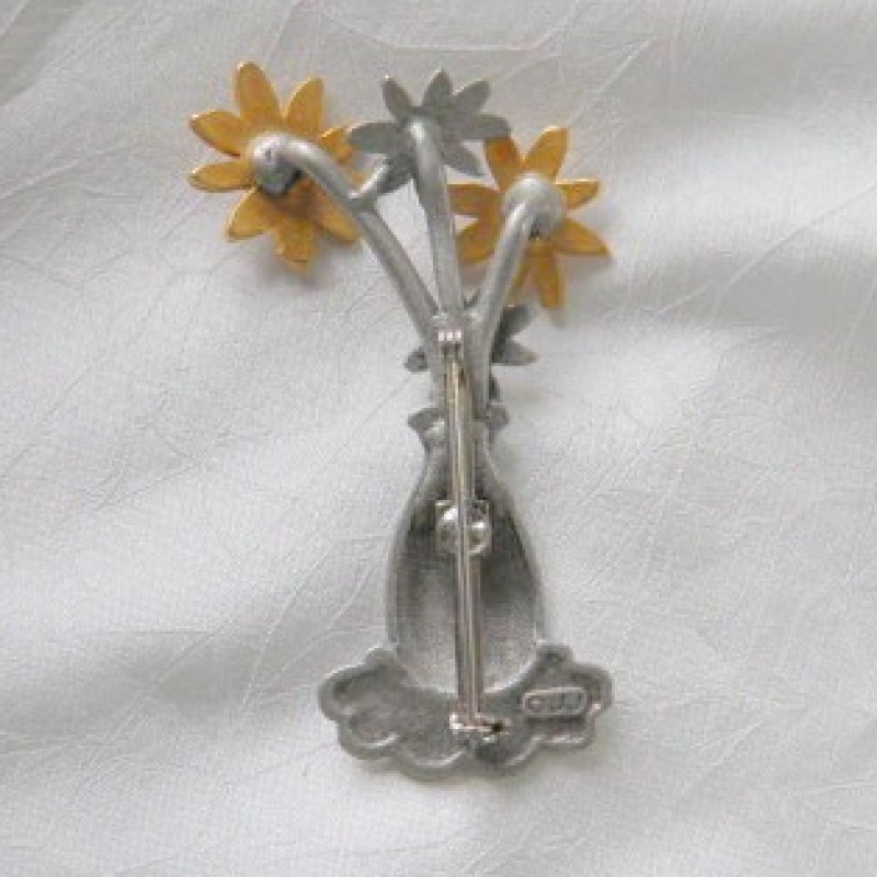 Description: Pewter wash flowers in a vase signed JJ. Gold tone and pewter wash over metal. 3" x 2" Good condition.