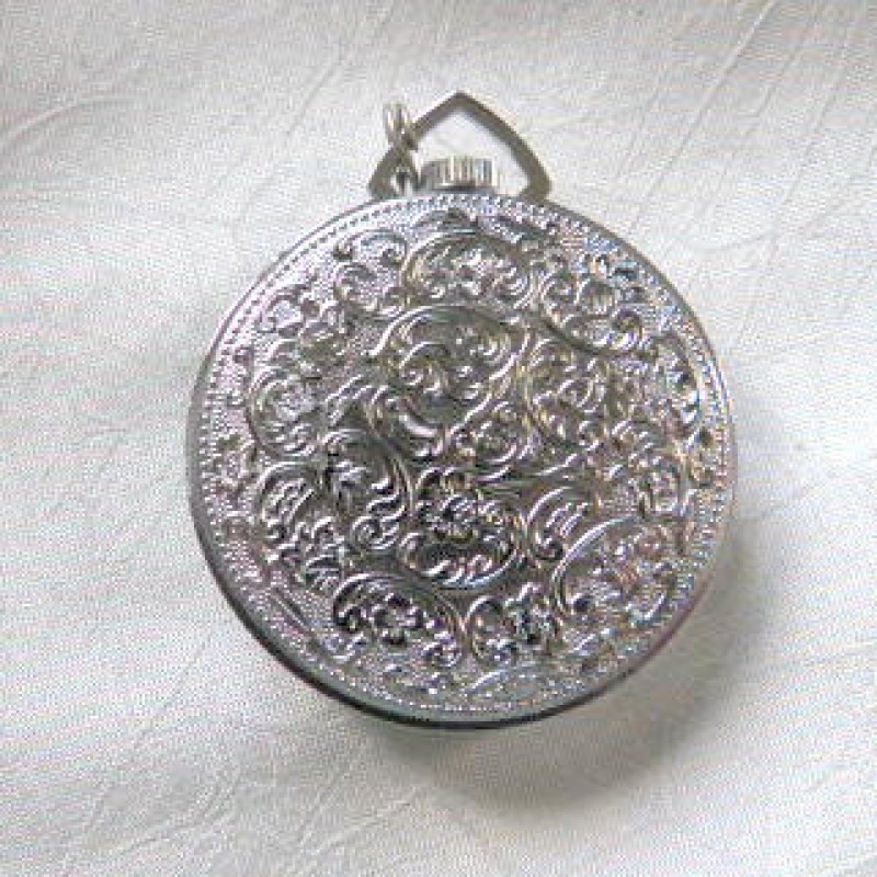 Description: WOLDMAN small pocket watch/pendant. 1-1/2" diameter round silver tone watch has a lot of details to its front and back. It is in working order, the wind-up type and in good condition.