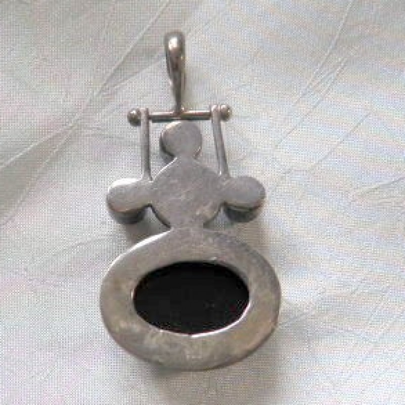 Description: Modern styled pendant marked 925. A large black faceted open back stone is the centerpiece; above are grey and white faux stones/pearls. Size is 1-3/4" x 1". It is unsigned.