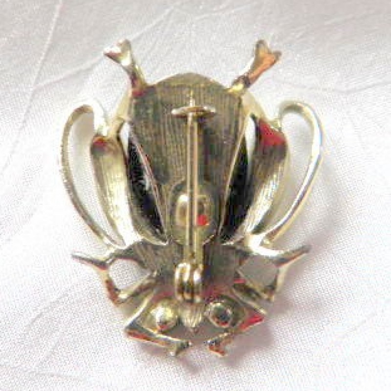 Description: Great bumble bee pin. He has a black molded glass body, red rhinestone eyes and silver wings and feet. Size is 1-1/8" x 1-1/8". He is in good condition.