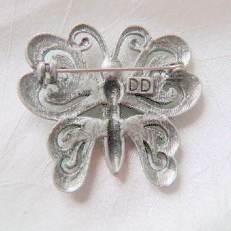 Description: Pretty painted butterfly pin . It has painted green wings, bronze colored body and rhinestone accents. It is 1-5/8" x 1-1/2", marked "DD" and in good condition.