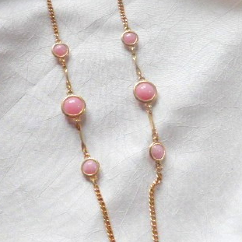 Description: Opera length necklace, 32" , made by Sarah Coventry during the 1970's. It is embellished with double sided pink cabachons on a gold tone chain. Condition is very good.