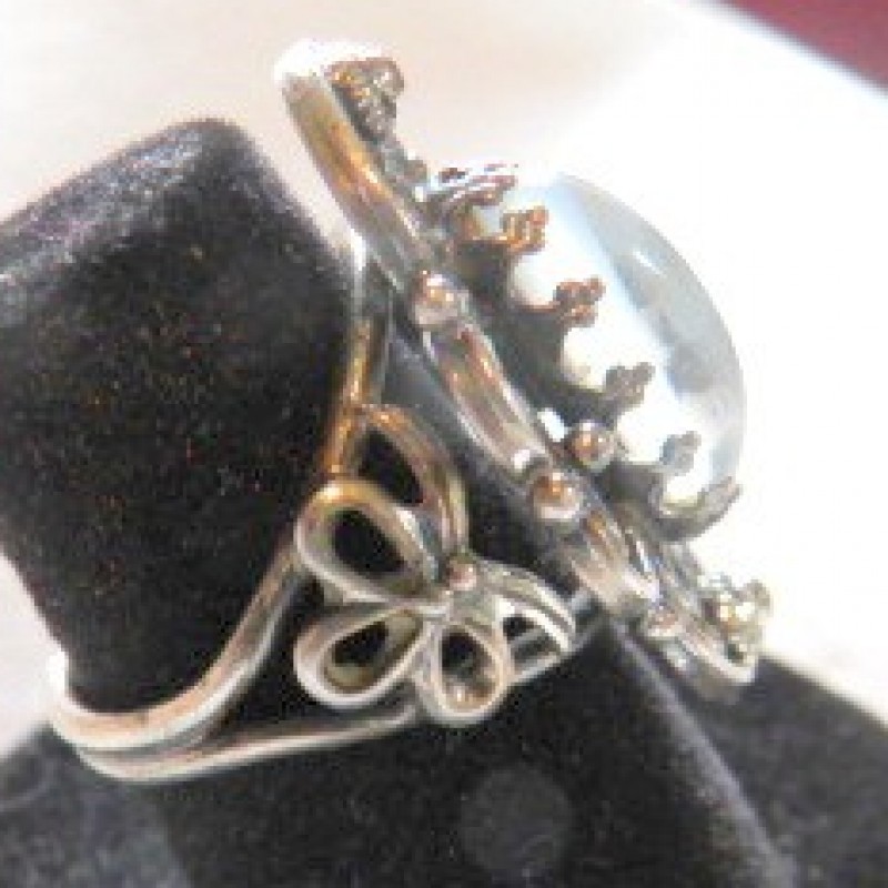 Description: Nice sterling silver ladies ring. Silver swirls surround a pretty pale blue oval moonstone. The stone is 1/2" x 1/4". The ring is about a size 5. It is marked Sterling and in good condition.