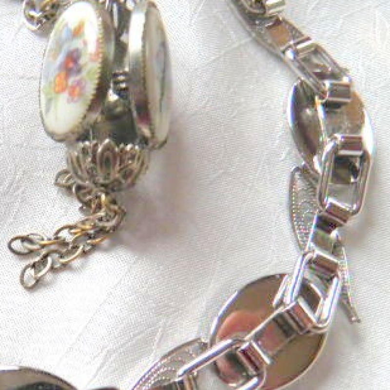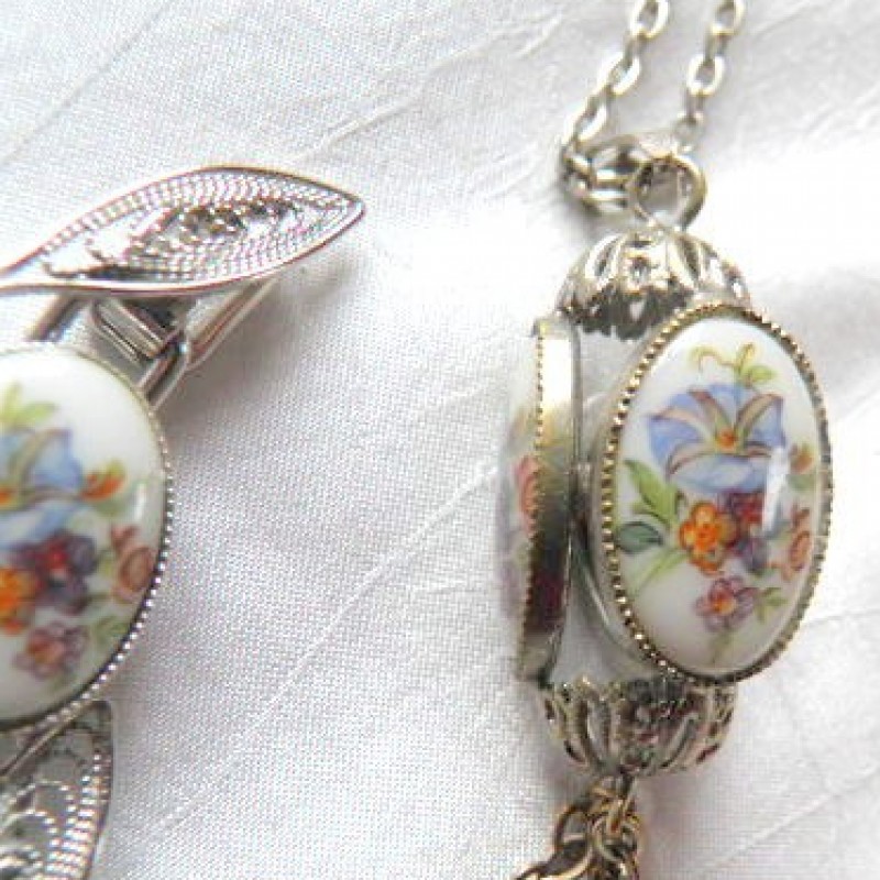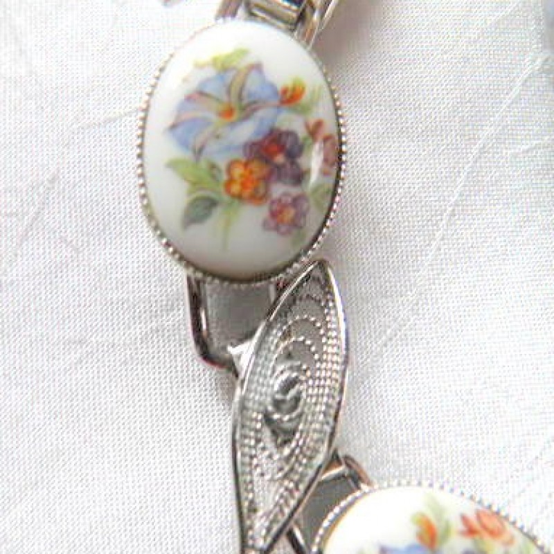 Description: Unique necklace and bracelet set. Silver tone filagree elements alternate with oval painted porcelain cabs. The necklace has a dimensional piece with the porcelain cabs and a dangling chain at its' bottom. The bracelet has a fold over clasp and is 7" long. The chain on the necklace is 24" long. Each porcelain oval is 7/8" x 1/2". Both pieces are in good condition.