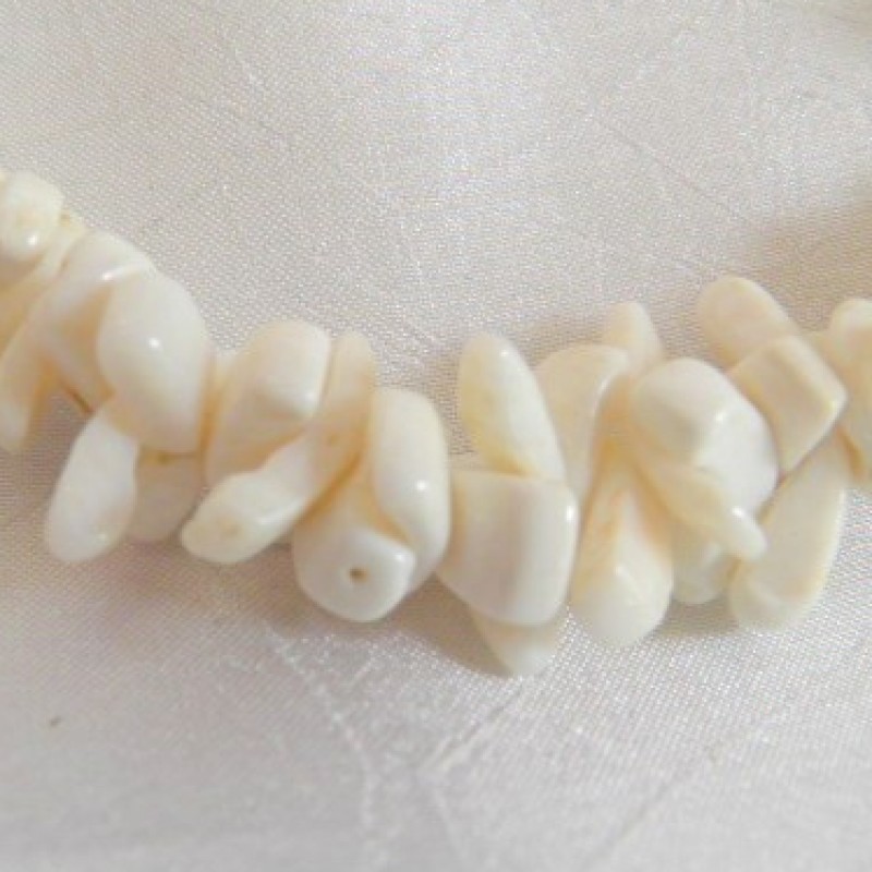 Description: Great necklace made up of curved shapes of white to off white shell pieces strung together. This piece is about 16" long and has a screw - barrel type closure. It is in good condition.