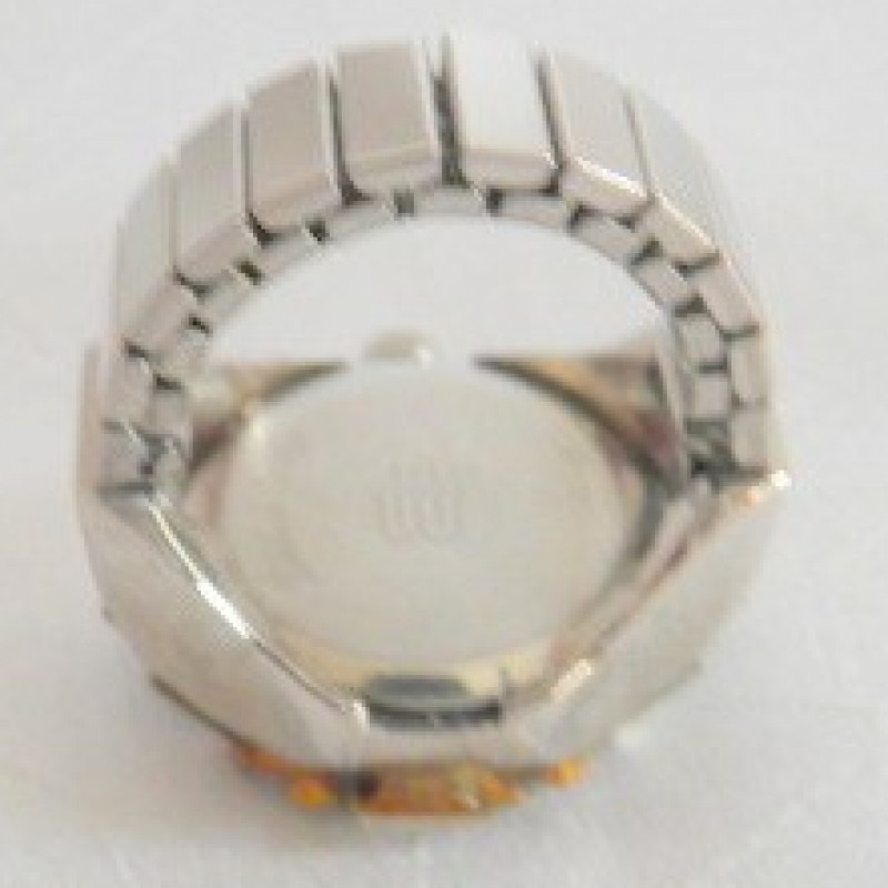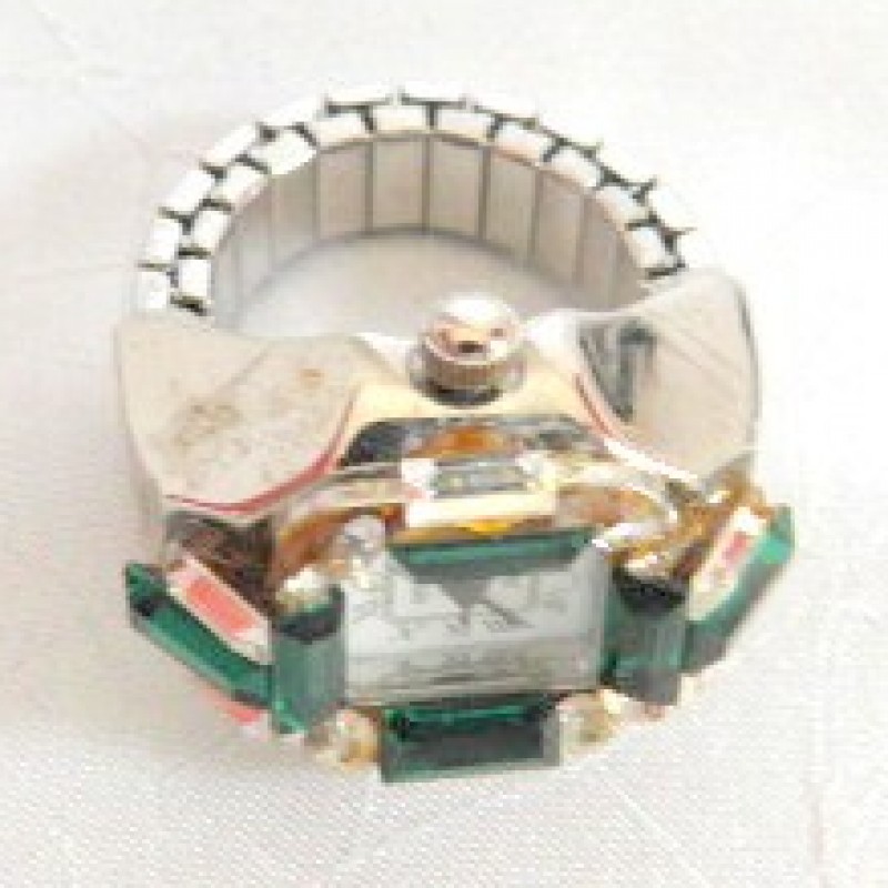 Description: Pretty watch worn as a ring. It has an expandable band. It is marked on the face Digits TM and Quartz. It is embellished with emerald green and clear rectangular rhinestones. It does need a battery, otherwise in good condition.