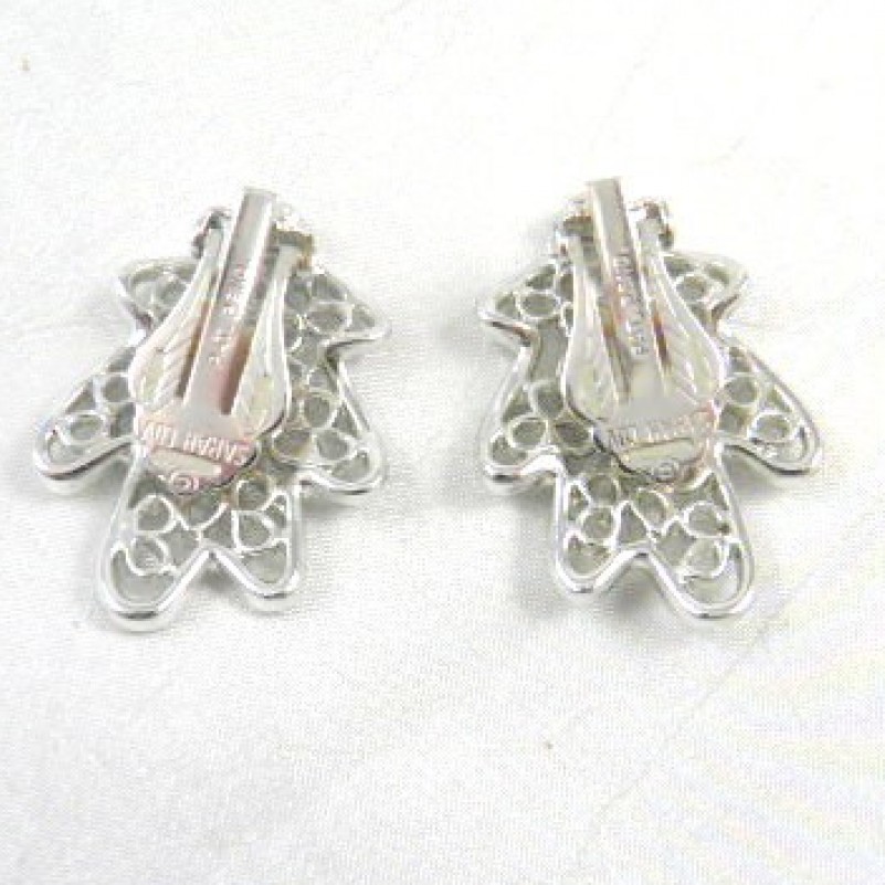 Description: Silver tone filagree leaf earrings, 1-7/8" x 1" across. Signed Sarah Cov and Pat Pend. Clip back style. Good condition.