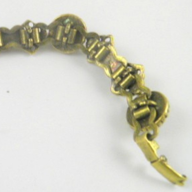 Description: Great vintage antique gold tone link bracelet with dark ruby stones (almost black looking ) and tiny clusters of seed pearls, 7" long with fold over clasp.