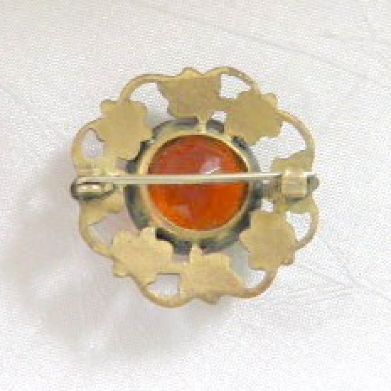 Description: Vintage pin with dark goldtone leaves circling a large orange colored round rhonestone. The pin is 1" in diameter and has a simple "c" clasp that dates it to be before 1940, I believe. The stone is 5/8" round and has an open back. It is unsigned and in good condition.