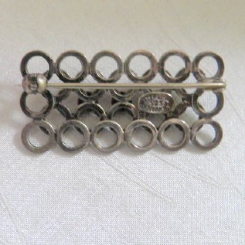 Description: This pin is either in the Art Deco style or mid-century modern era. Three rows of layered circles are topped with three silver balls. It is marked 925 Sterling and Denmark N.S. It is 1-1/2" x 3/4" and in good condition.