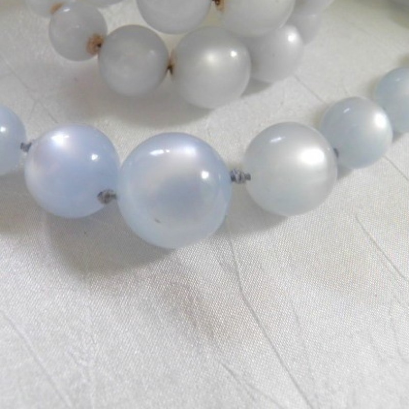 Description: Vintage powder blue beaded necklance and bracelet set with graduated sized beads from 1/4" to 5/8". The necklace 1s 16" long and the bracelet is an expandable spiral type. They are unsigned and in good condition.